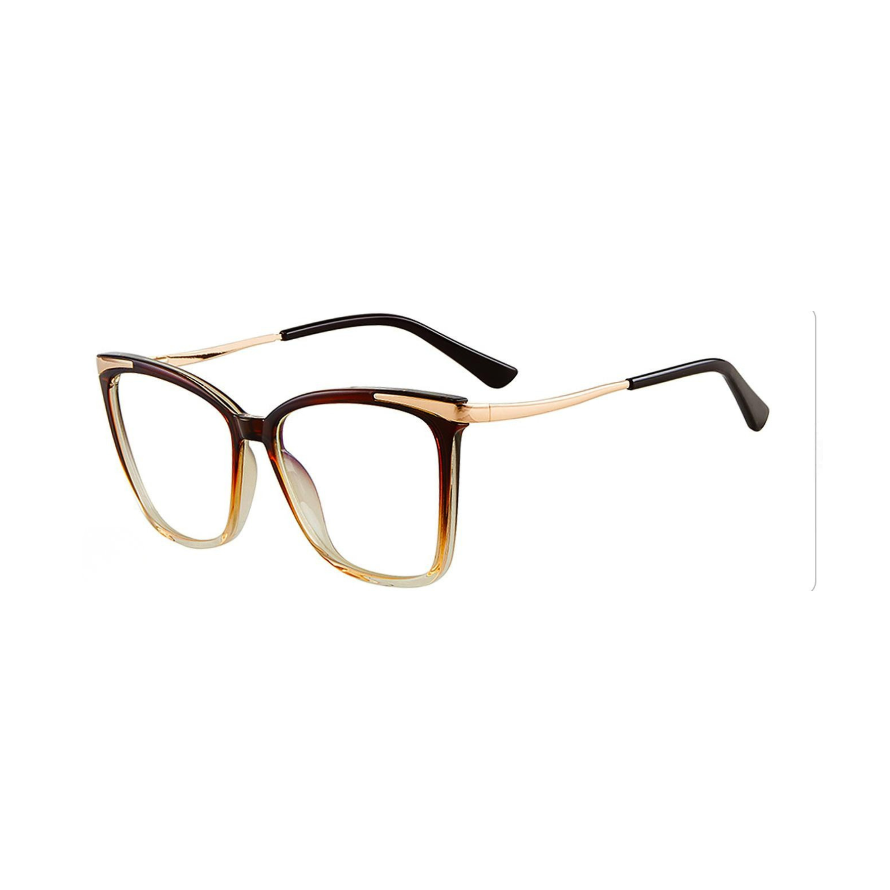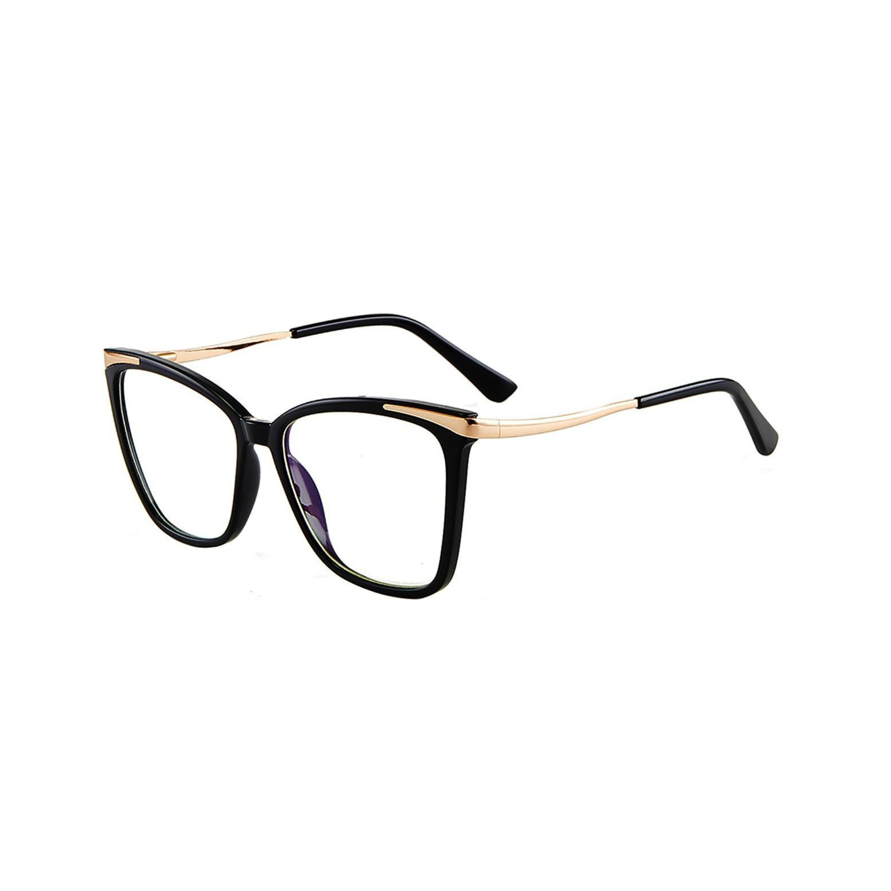 Black cat-eye glasses with gold accents on a white background